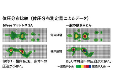 一般的には仰向きよりも横向きの方がマットレスや敷きふとんに接する面積が小さくなるため、一ヶ所の重さも増えて沈み込みも大きくなります。