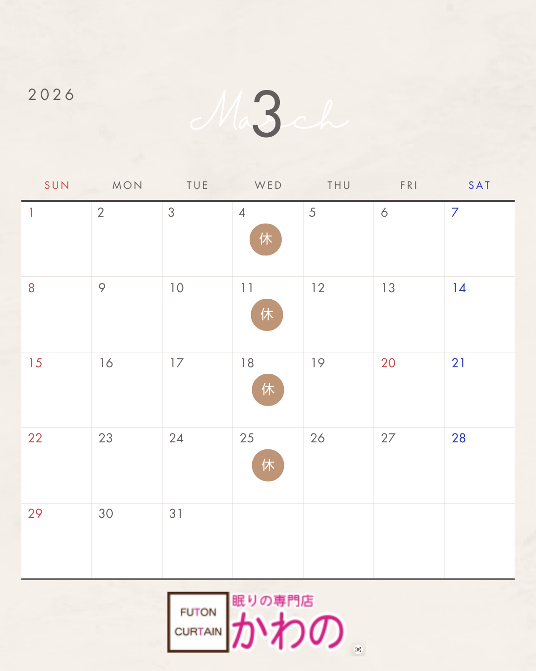 2026年3月の営業日のお知らせです。毎週水曜定休日で